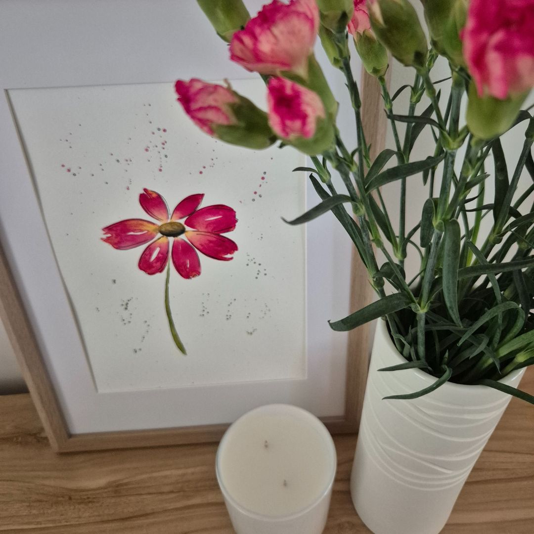This vibrant Cosmos flower will add just the right amount of colour to a space, either hanging with a collection of artworks in a girl’s room or leaning in a small frame on a console. It is sure to make you smile every time you walk by.