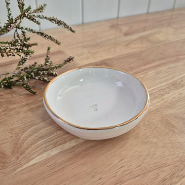 Handcrafted in Marrickville, New South Wales, by LouiseM Studio, these bowls are made from porcelain with clear glaze on the inside and gold lustre painted on the rim.
