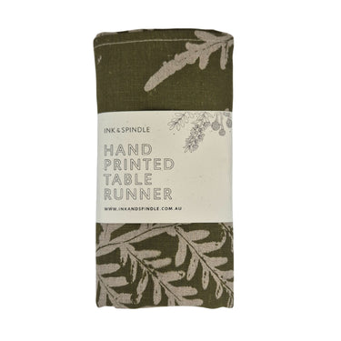 Ink & Spindle hand-print and sew their table runners in Abbotsford, Victoria, using organic certified, eco-friendly inks on Certified Belgian Linen, ensuring the highest quality and longevity.