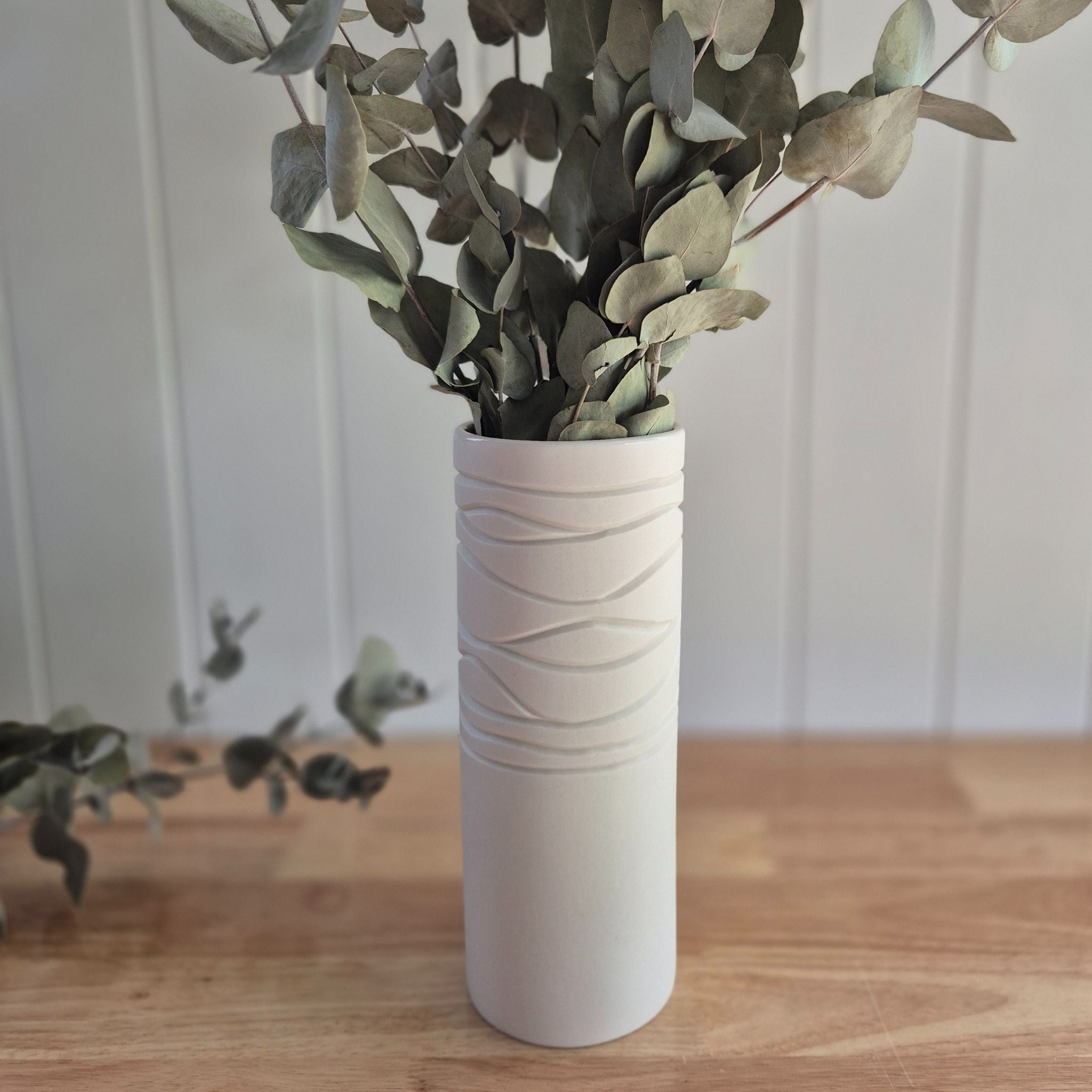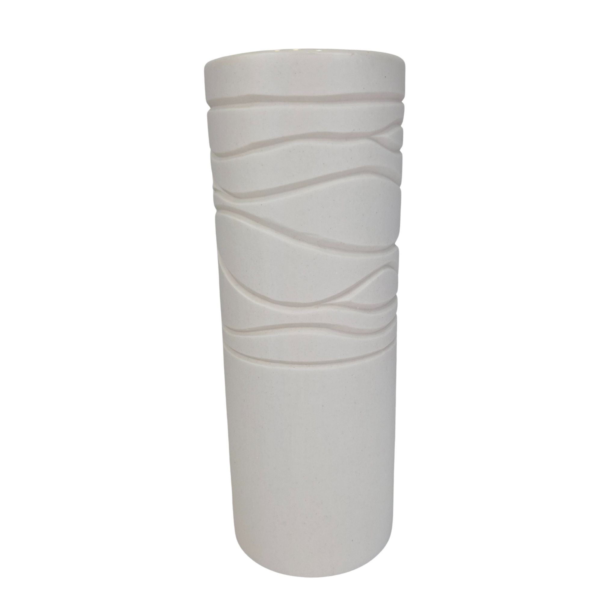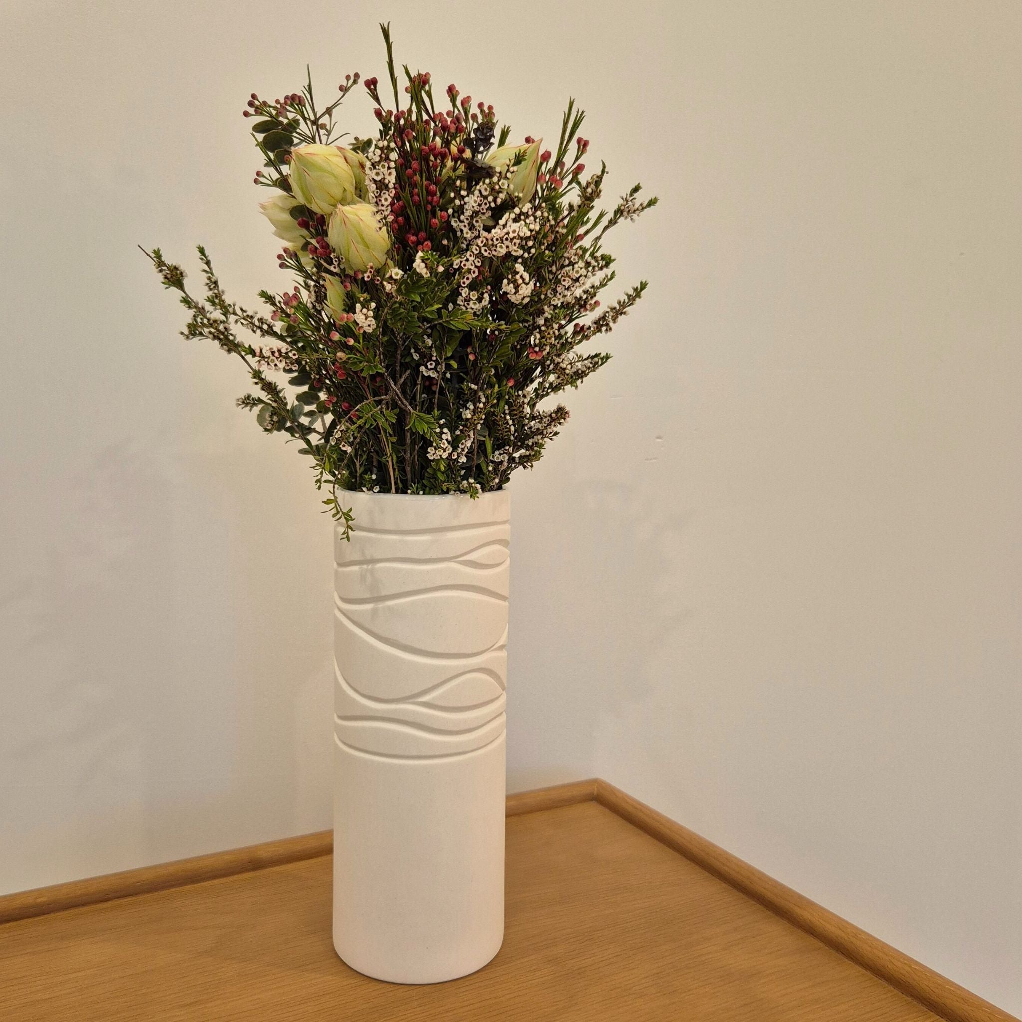 The Textured Vase in a ‘Crossed Wires’ pattern features lines that waver, overlap and connect as they move around the vase. The soft white vase is glazed on the inside to hold a colourful bunch of flowers, and unglazed on the outside, enhancing the hand-carved pattern and adding texture to your living room.