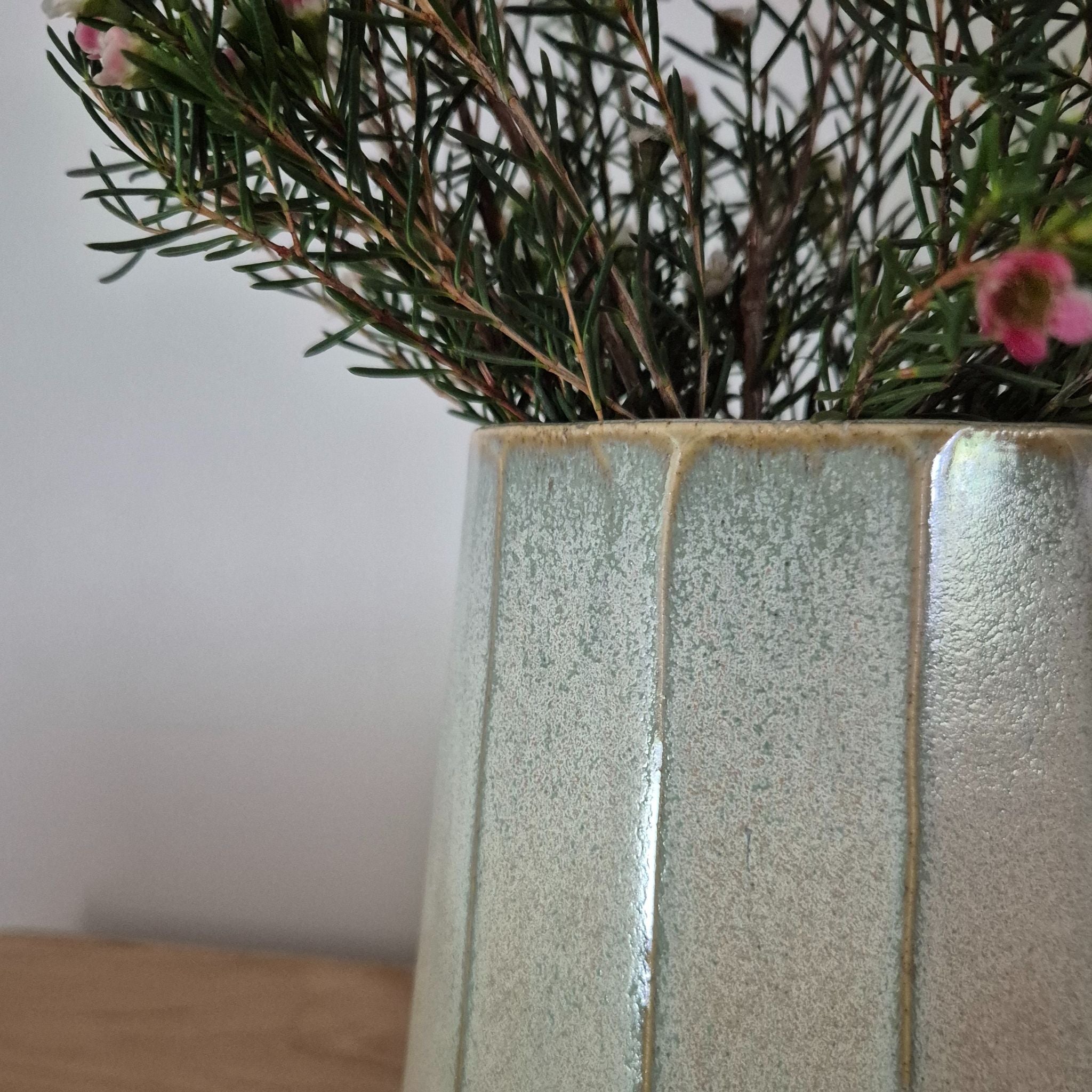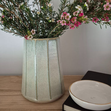 The Pillar Vase is a statement piece that looks just as impressive full of flowers as it does as a stand-alone décor piece. The subtle blue-green colour, accented by an earthy trim and a shimmery glaze, make the Pillar Vase in Pistachio a beautiful vase for a variety of styles.