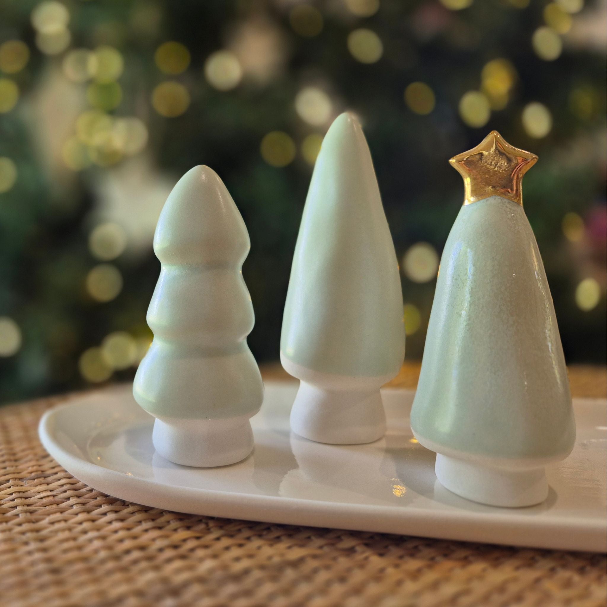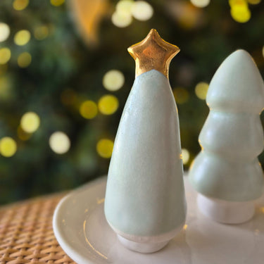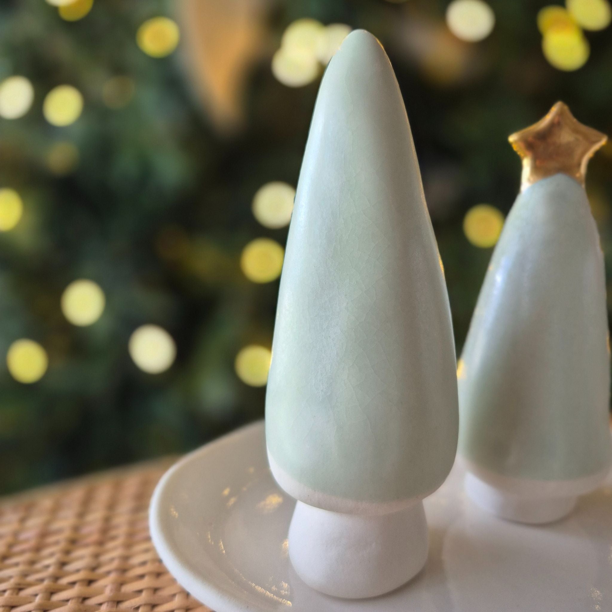 Bring a touch of modern Christmas charm to your home with these handcrafted ceramic trees. Softly glazed in pastel green and finished with a true gold lustre star applied by hand, each tree is beautiful on their own or gathered as a set, adding a subtle festive warmth to your table, bookshelf or hallway display.