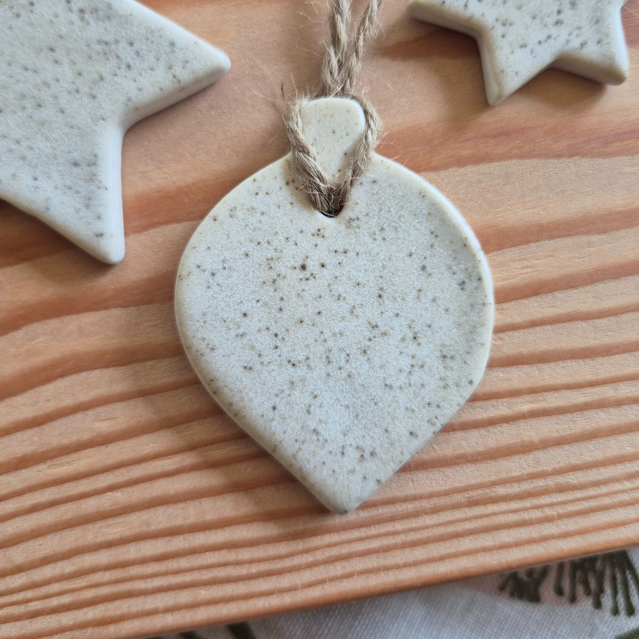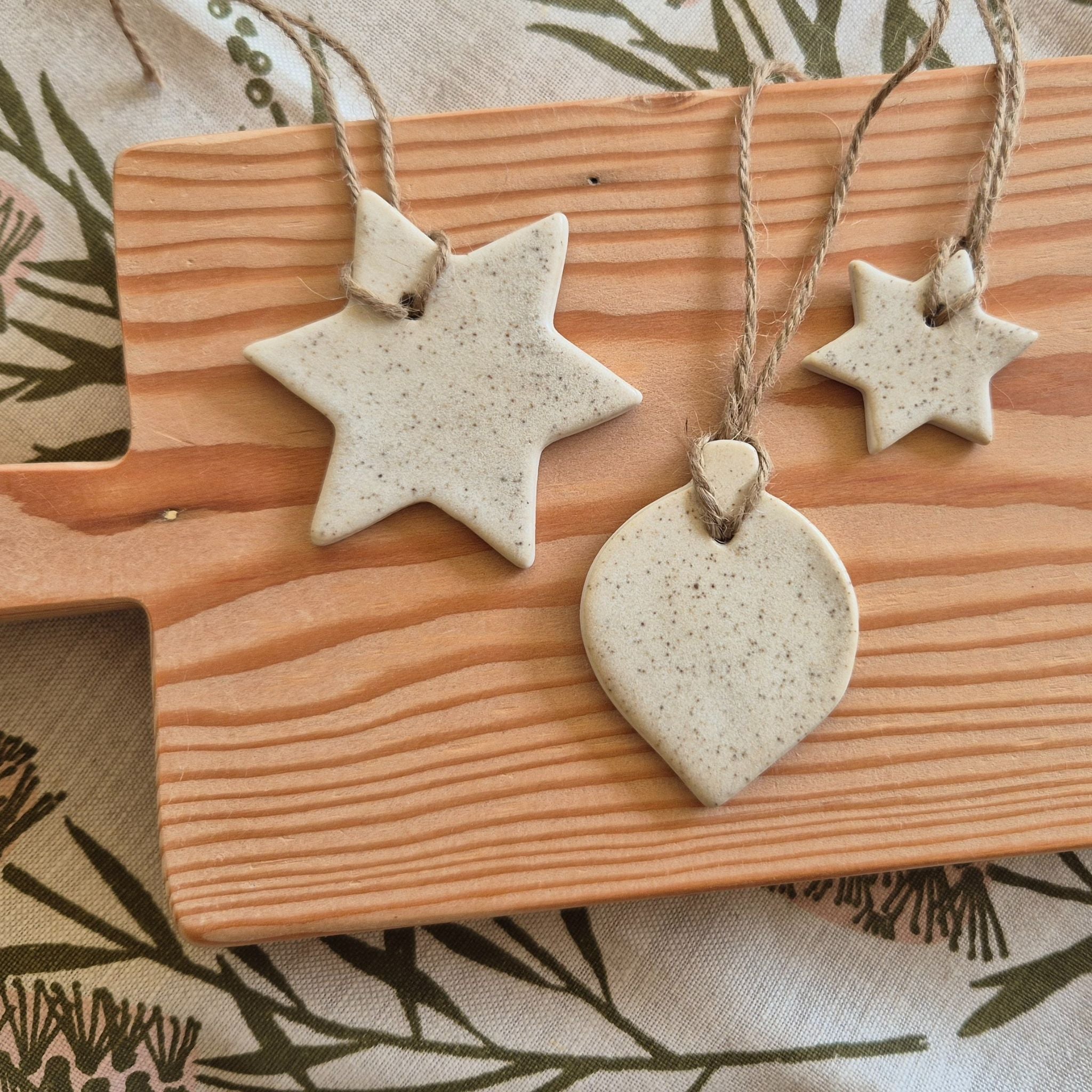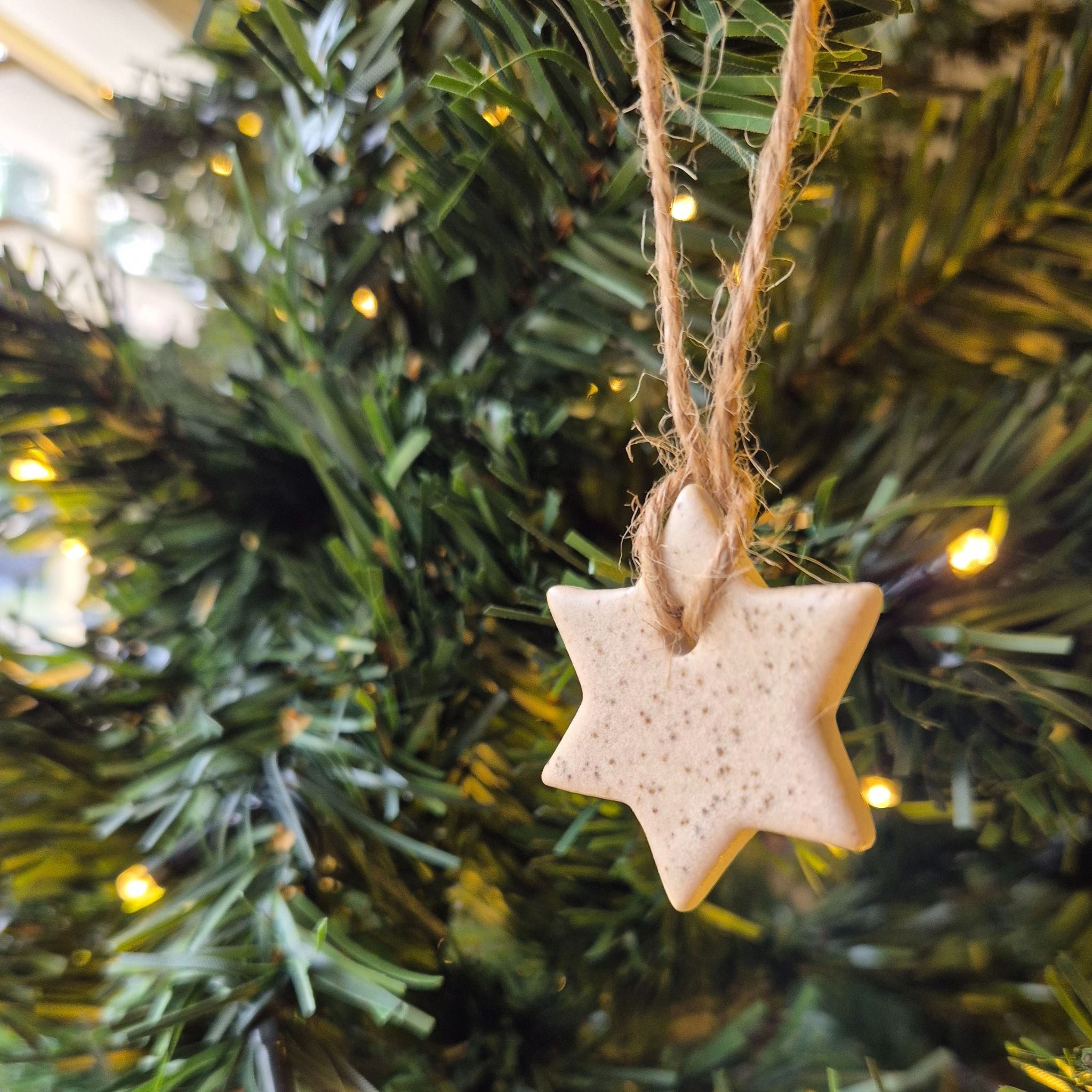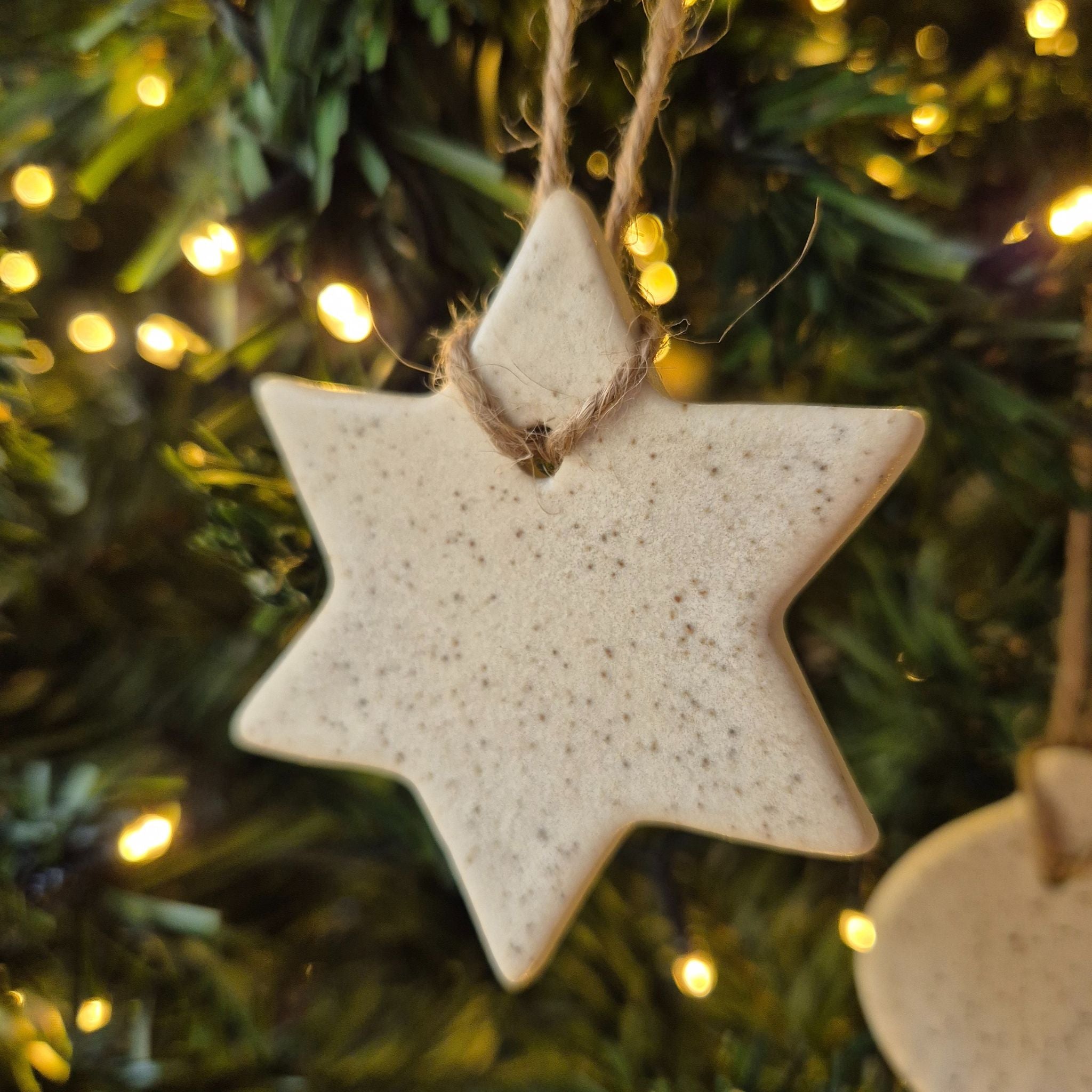 Bring a touch of handmade beauty to your festive season with these ceramic ornaments, finished in a speckled white satin glaze. Choose from the bauble, large star or small star, or style them together for a cohesive look. Each ornament is crafted by hand to celebrate the joy of Christmas, perfect for hanging on the tree, tying to gifts, or adding a thoughtful touch to your table.
